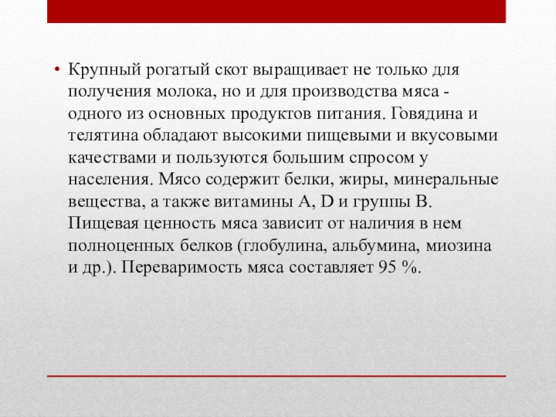 для производства мяса - одного из основных продуктов питания. Говядина и телятина обладают высокими пищевыми и вкусовыми качествами и пользуются большим спросом у населения. Мясо содержит белки, жиры, минеральные вещества, а также витамины A, D и группы В. Пищевая ценность мяса зависит от наличия в нем полноценных белков (глобулина, альбумина, миозина и др.). Переваримость мяса составляет 95 %.