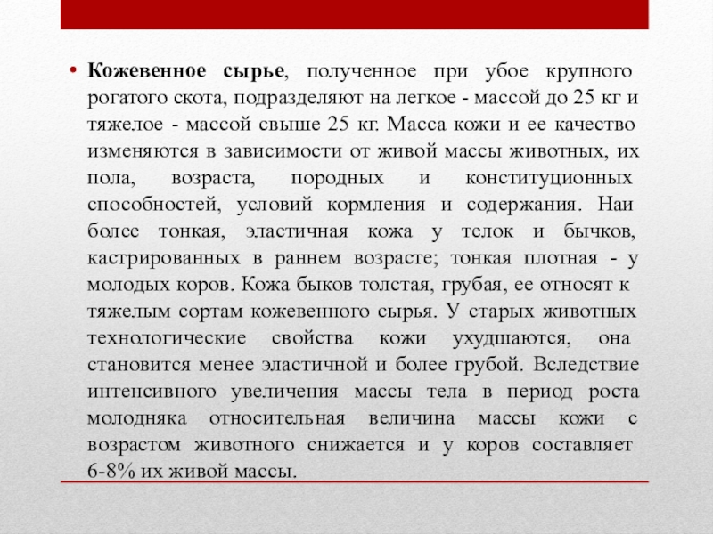 Слайд 9Кожевенное сырье, полученное при убое крупного рогатого скота, подразделяют на легкое
