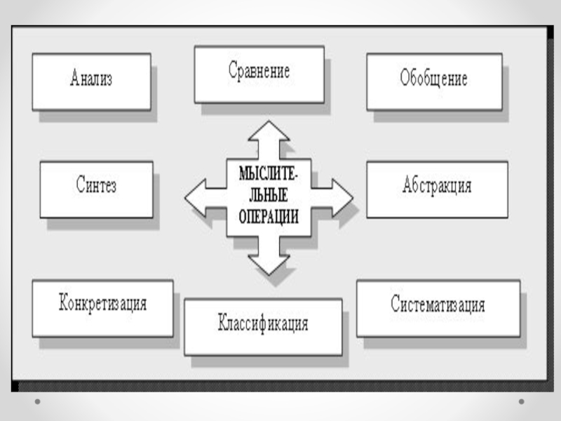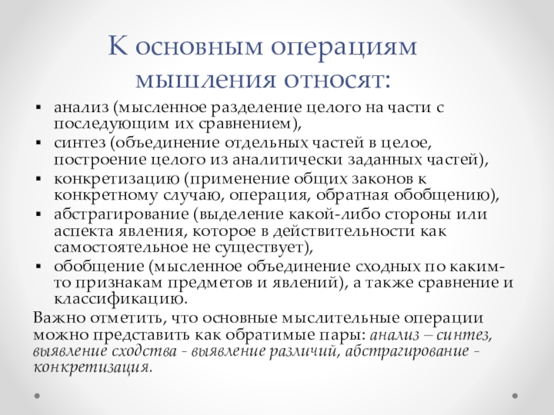 Важно отметить, что основные мыслительные операции можно представить как обратимые пары: анализ – синтез, выявление сходства - выявление различий, абстрагирование - конкретизация.