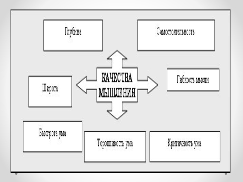 В-четвертых, мышление проявляется через следующие способы: индукция, дедукция, метод мышления по аналогии, широта мышления, глубина мышления, самостоятельность мышления, гибкость мысли, быстрота ума, торопливость ума, критичность.