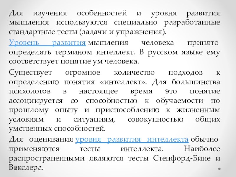Слайд 22Для изучения особенностей и уровня развития мышления используются специально разработанные стандартные