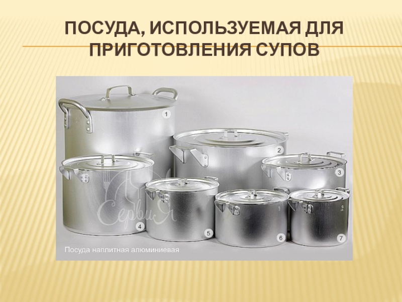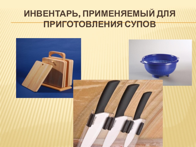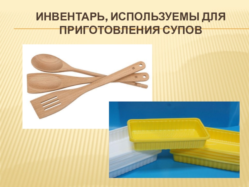 Слайд 27Инвентарь, применяемый для приготовления супов