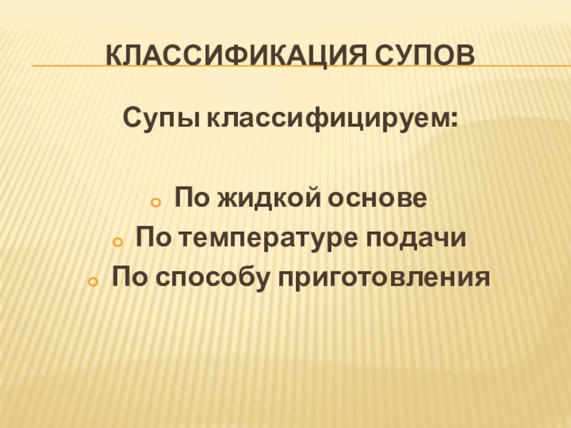 Классификация суповСупы классифицируем:По жидкой основеПо температуре подачиПо способу приготовления