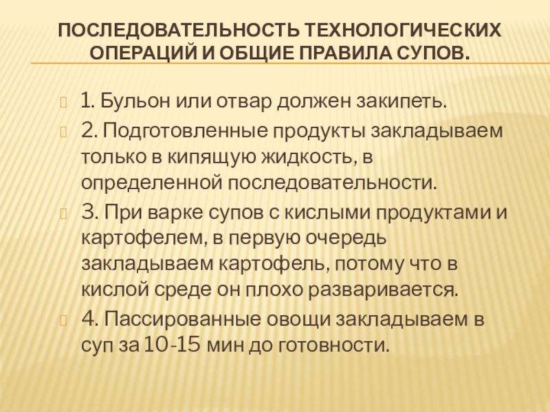 Слайд 30Последовательность технологических операций и общие правила супов.