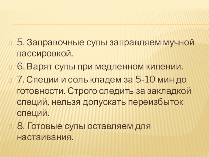 5. Заправочные супы заправляем мучной пассировкой.6. Варят супы при медленном кипении.7. Специи и соль кладем за 5-10