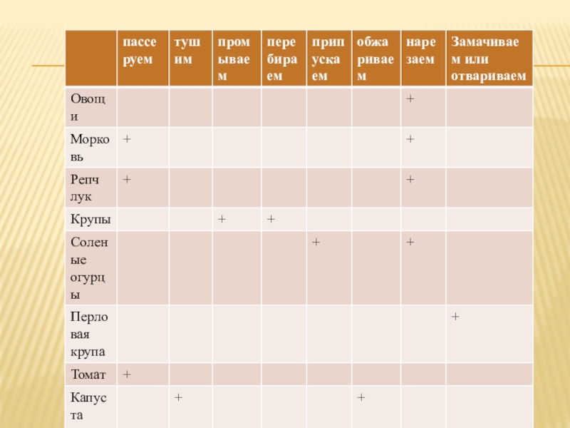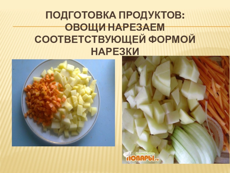 Слайд 15Подготовка продуктов: овощи нарезаем соответствующей формой нарезки