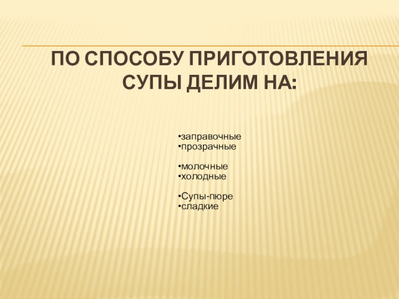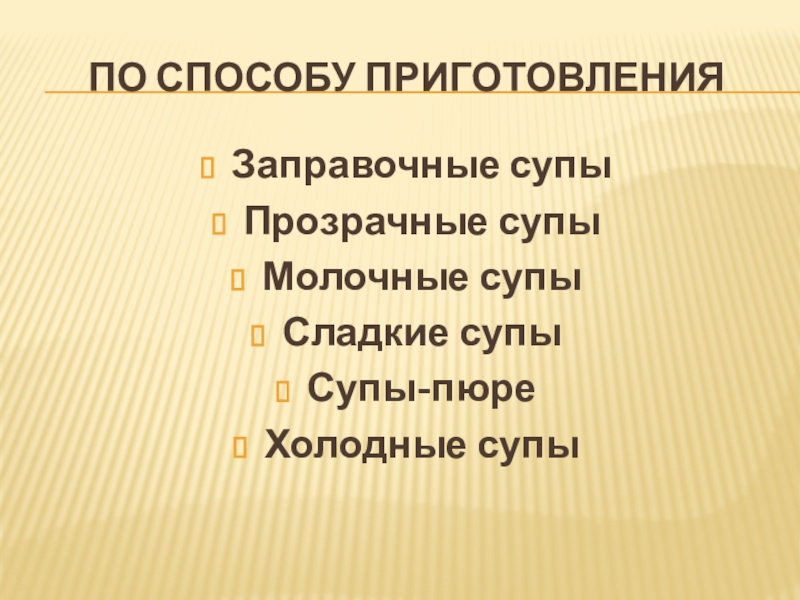 По способу приготовленияЗаправочные супыПрозрачные супыМолочные супыСладкие супыСупы-пюреХолодные супы