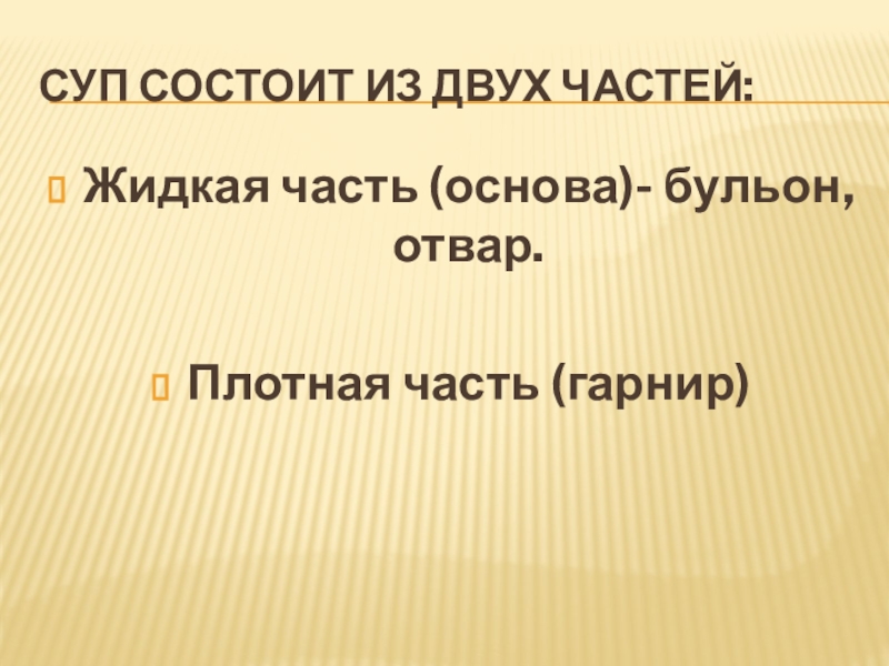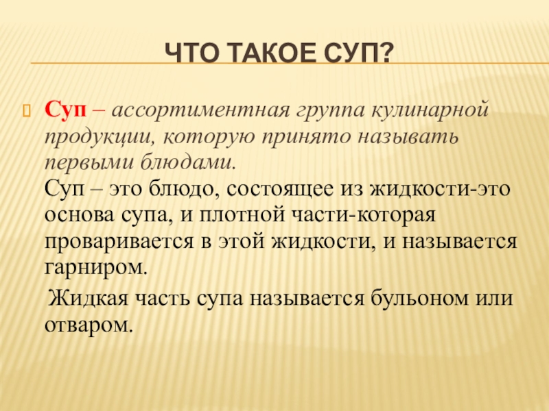 первыми блюдами. Суп – это блюдо, состоящее из жидкости-это основа супа, и плотной части-которая проваривается в этой жидкости, и называется гарниром.