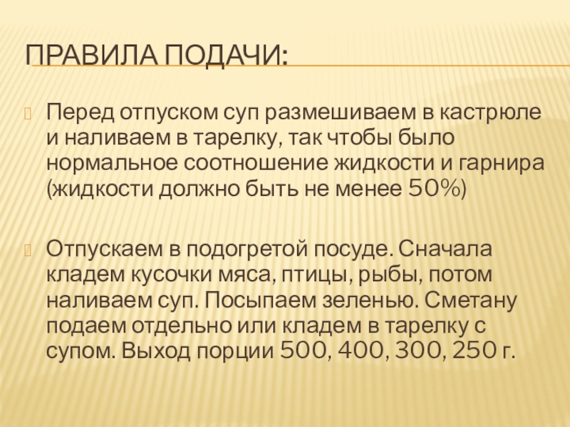 Способы сервировки, варианты оформления и подачи супов, температура подачи, требования к качеству