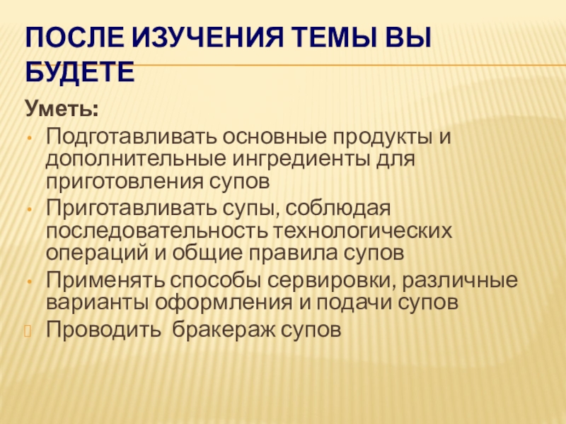 После изучения темы вы будетеУметь:Подготавливать основные продукты и дополнительные ингредиенты для приготовления суповПриготавливать супы, соблюдая последовательность технологических