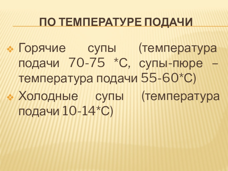 По температуре подачиГорячие супы (температура подачи 70-75 *С, супы-пюре – температура подачи 55-60*С)Холодные супы (температура подачи 10-14*С)