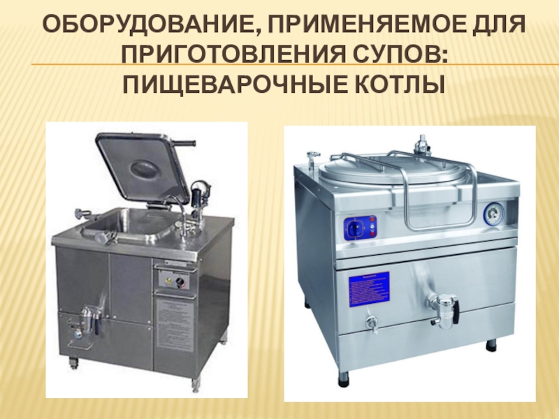Слайд 24Оборудование, применяемое для приготовления супов: пищеварочные котлы