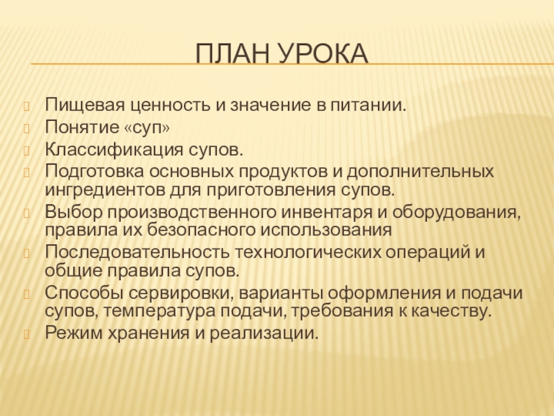 План урокаПищевая ценность и значение в питании.Понятие «суп»Классификация супов.Подготовка основных продуктов и дополнительных ингредиентов для приготовления супов.Выбор производственного инвентаря и оборудования, правила их безопасного использованияПоследовательность технологических операций и общие правила супов.Способы сервировки, варианты оформления и подачи