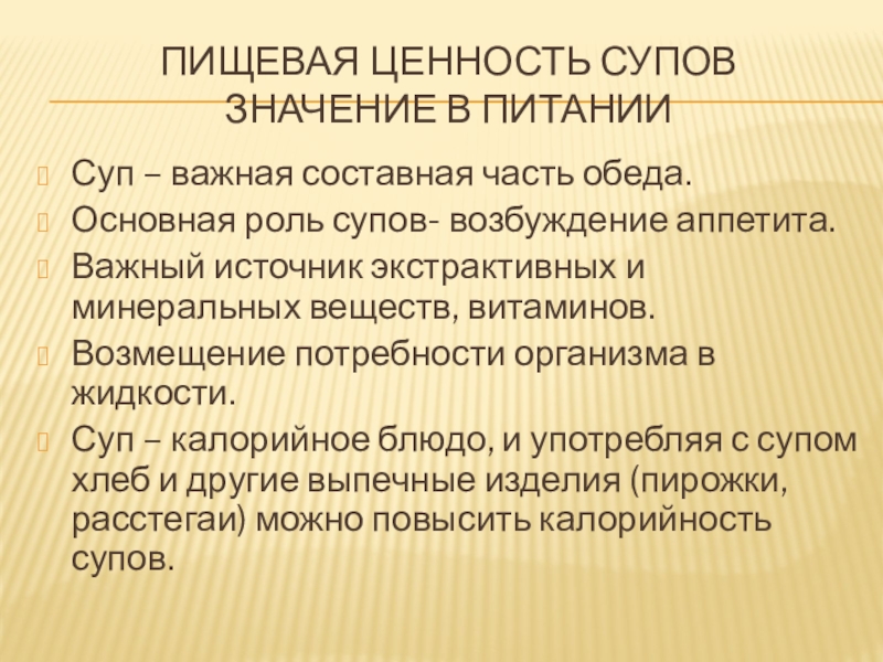 Пищевая ценность супов  Значение в питанииСуп – важная составная часть обеда.Основная роль супов- возбуждение аппетита.Важный источник