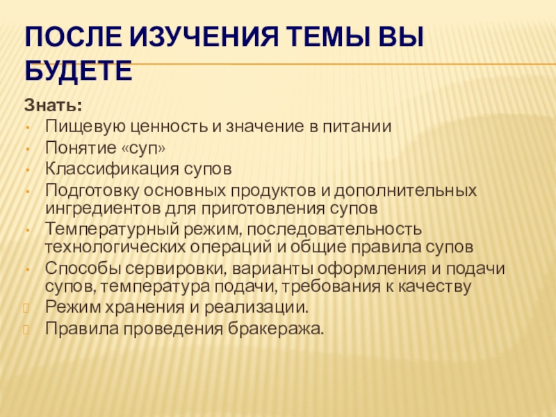 После изучения темы вы будетеЗнать:Пищевую ценность и значение в питанииПонятие «суп»Классификация суповПодготовку основных продуктов и дополнительных ингредиентов