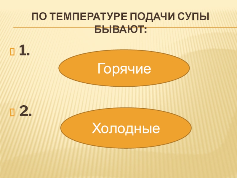 По температуре подачи супы бывают:1. 2. ГорячиеХолодные