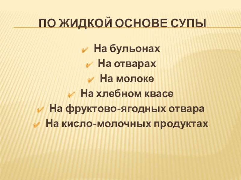 По жидкой основе супы На бульонахНа отварахНа молокеНа хлебном квасеНа фруктово-ягодных отвараНа кисло-молочных продуктах