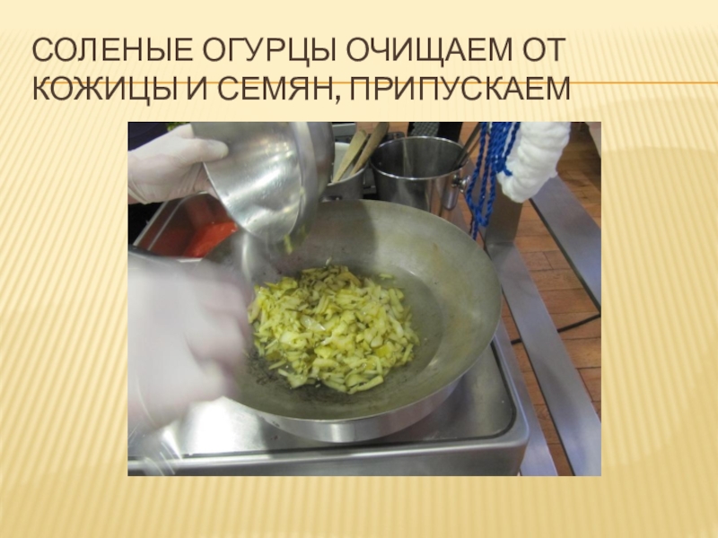 Слайд 20Соленые огурцы очищаем от кожицы и семян, припускаем