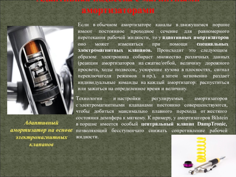 Технологии и настройки регулируемых амортизаторов с электромагнитными клапанами постоянно совершенствуются, чтобы добиться максимально плавного перехода от жесткого состояния демпфера к мягкому. К примеру, у амортизаторов Bilstein в поршне имеется особый центральный клапан DampTronic, позволяющий бесступенчато снижать сопротивление рабочей жидкости.