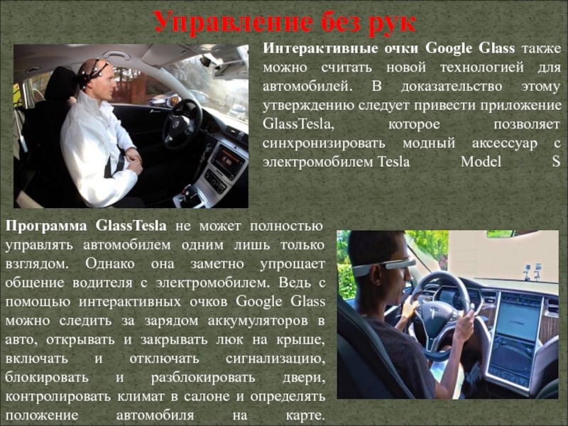 Программа GlassTesla не может полностью управлять автомобилем одним лишь только взглядом. Однако она заметно упрощает общение водителя с электромобилем. Ведь с помощью интерактивных очков Google Glass можно следить за зарядом аккумуляторов в авто, открывать и закрывать люк на крыше, включать и отключать сигнализацию, блокировать и разблокировать двери, контролировать климат в салоне и определять положение автомобиля на карте.