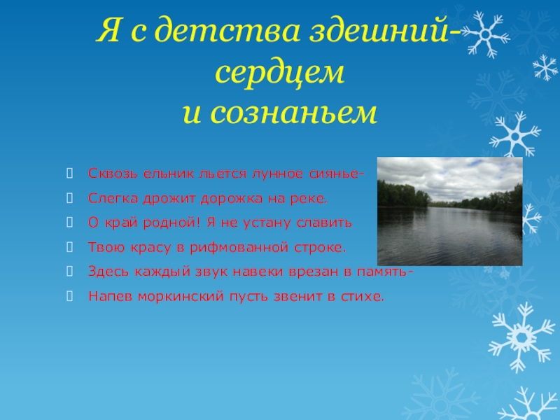 Я с детства здешний-сердцем и сознаньемСквозь ельник льется лунное сиянье-Слегка дрожит дорожка на реке.О край родной! Я