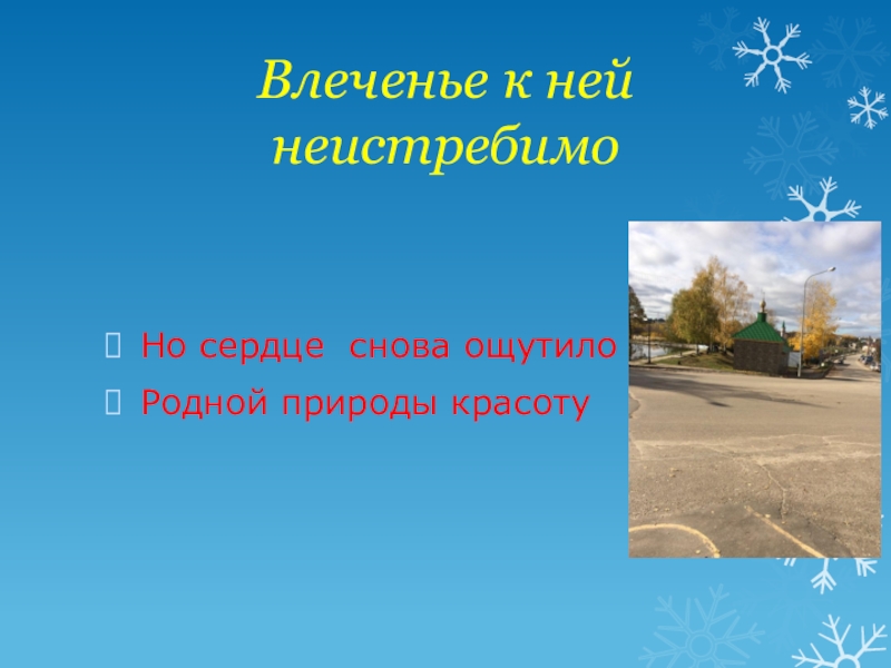 Влеченье к ней неистребимоНо сердце снова ощутилоРодной природы красоту