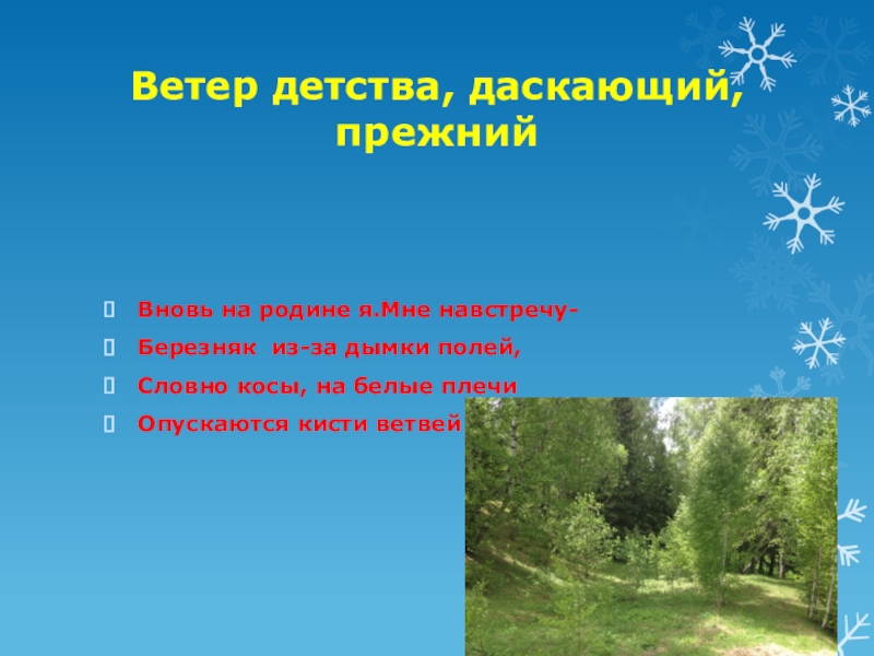 Ветер детства, даскающий, прежнийВновь на родине я.Мне навстречу-Березняк из-за дымки полей,Словно косы, на белые плечиОпускаются кисти ветвей