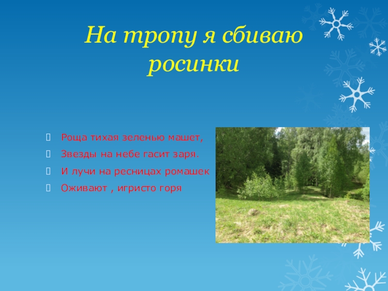 На тропу я сбиваю росинкиРоща тихая зеленью машет,Звезды на небе гасит заря.И лучи на ресницах ромашекОживают ,
