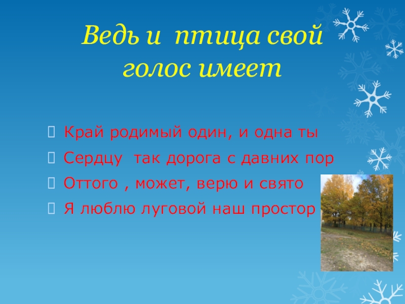 Ведь и птица свой голос имеетКрай родимый один, и одна тыСердцу так дорога с давних порОттого ,