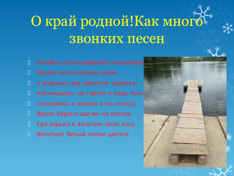 О край родной!Как много звонких песенРучей в лугах сверкает на изломах,Играет тихо песенку свою.У родника под шепеток
