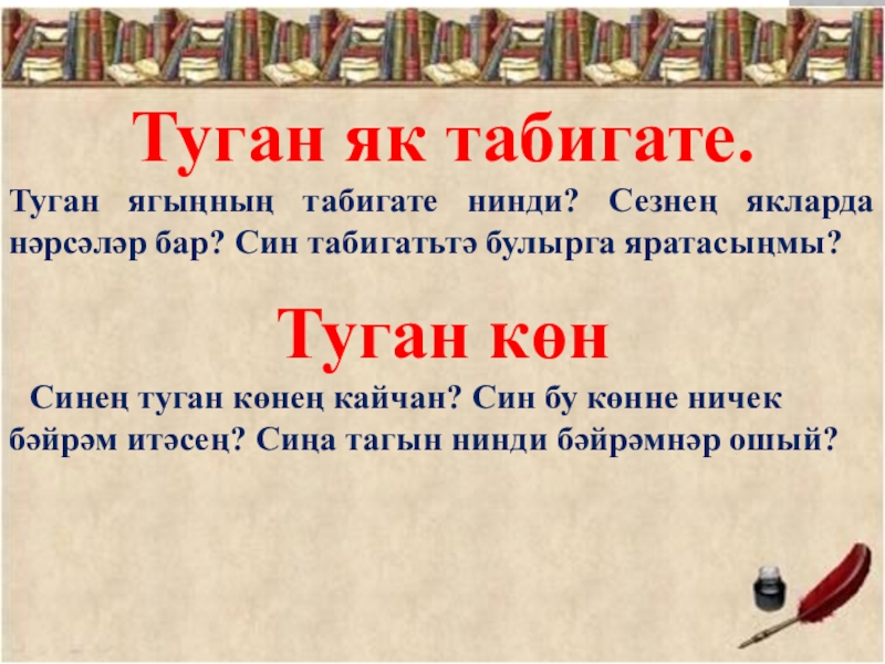 Туган ягыңның табигате нинди? Сезнең якларда нәрсәләр бар? Син табигатьтә булырга яратасыңмы?
