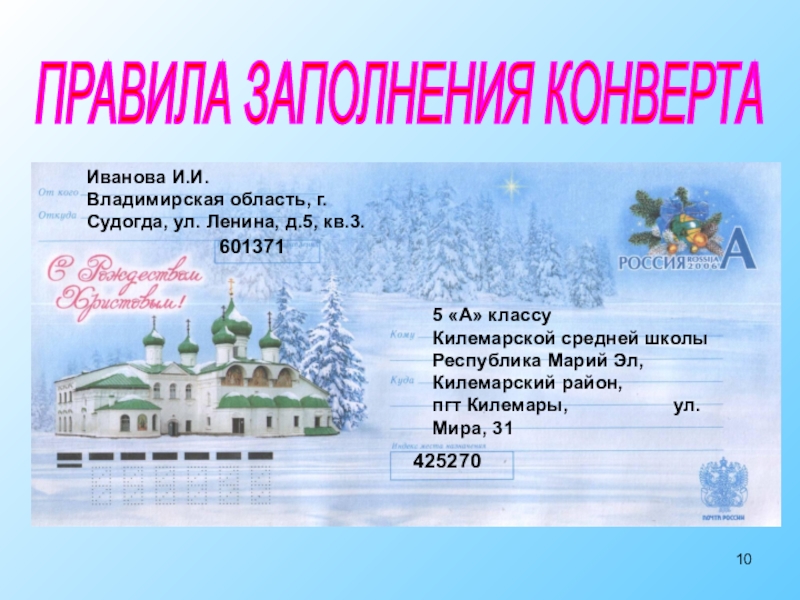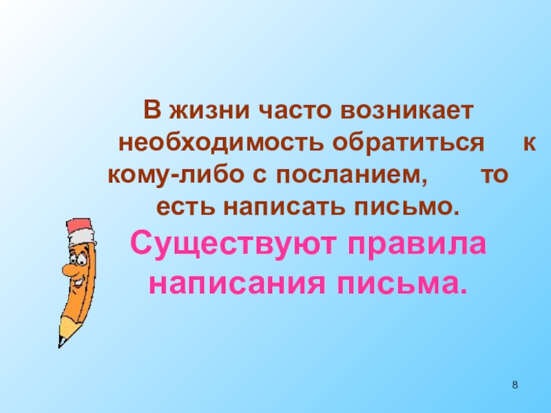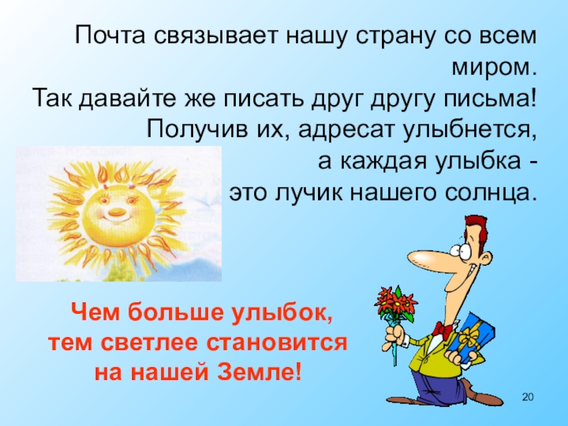 Почта связывает нашу страну со всем миром. Так давайте же писать друг другу письма! Получив их, адресат улыбнется, а каждая улыбка - это лучик нашего солнца.