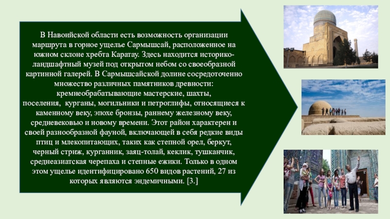 Слайд 13В Навоийской области есть возможность организации маршрута в горное ущелье Сармышсай,