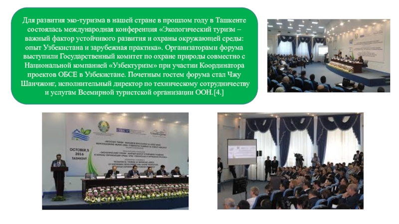 состоялась международная конференция «Экологический туризм – важный фактор устойчивого развития и охраны окружающей среды: опыт Узбекистана и зарубежная практика». Организаторами форума выступили Государственный комитет по охране природы совместно с Национальной компанией «Узбектуризм» при участии Координатора проектов ОБСЕ в Узбекистане. Почетным гостем форума стал Чжу Шанчжонг, исполнительный директор по техническому сотрудничеству и услугам Всемирной туристской организации ООН.[4.]
