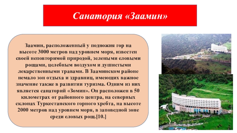 уровнем моря, известен своей неповторимой природой, зелеными еловыми рощами, целебным воздухом и душистыми лекарственными травами. В Зааминском районе немало зон отдыха и здравниц, имеющих важное значение также в развитии туризма. Одним из них является санаторий «Зомин». Он расположен в 50 километрах от районного центра, на северных склонах Туркестанского горного хребта, на высоте 2000 метров над уровнем моря, в заповедной зоне среди еловых рощ.[10.]