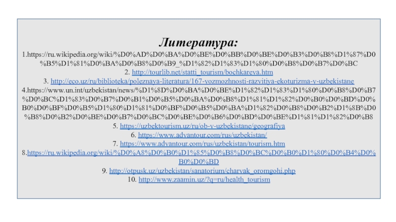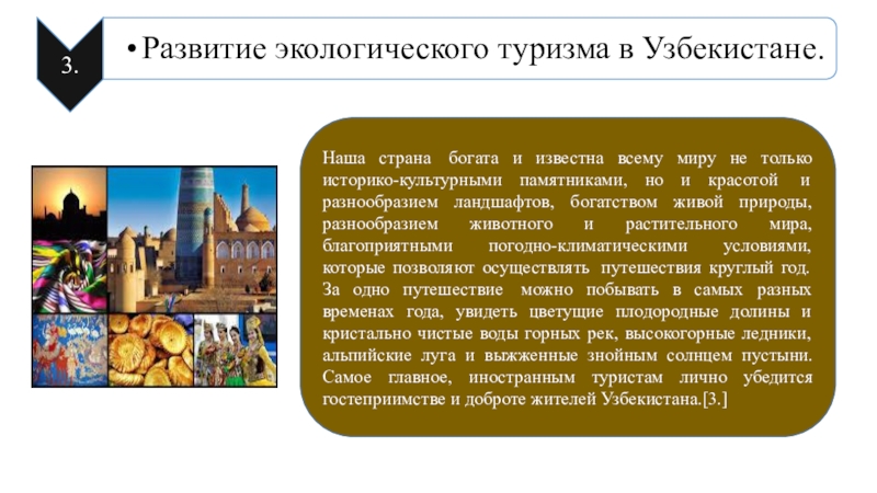 3. http://eco.uz/ru/biblioteka/poleznaya-literatura/167-vozmozhnosti-razvitiya-ekoturizma-v-uzbekistane