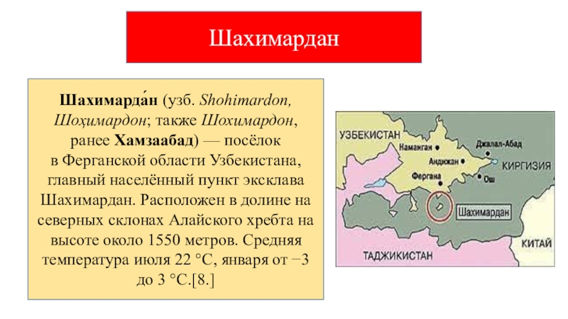 Слайд 25Шахимарда́н (узб. Shohimardon, Шоҳимардон; также Шохимардон, ранее Хамзаабад) — посёлок в Ферганской области Узбекистана, главный населённый пункт эксклава