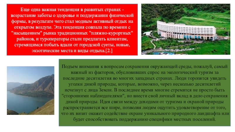 здоровье и поддержании физической формы, в результате чего стал модным активный отдых на открытом воздухе. Эта тенденция совпала по времени с "насыщением" рынка традиционных "пляжно-курортных" районов, и туроператоры стали предлагать клиентам, стремящимся побыть вдали от городской суеты, новые, экзотические места и виды отдыха.[2.]
