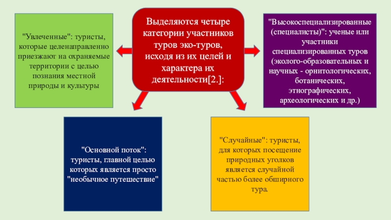 Слайд 8Выделяются четыре категории участников туров эко-туров, исходя из их целей и