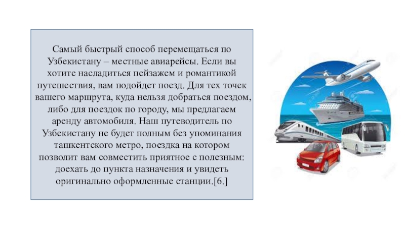 хотите насладиться пейзажем и романтикой путешествия, вам подойдет поезд. Для тех точек вашего маршрута, куда нельзя добраться поездом, либо для поездок по городу, мы предлагаем аренду автомобиля. Наш путеводитель по Узбекистану не будет полным без упоминания ташкентского метро, поездка на котором позволит вам совместить приятное с полезным: доехать до пункта назначения и увидеть оригинально оформленные станции.[6.]