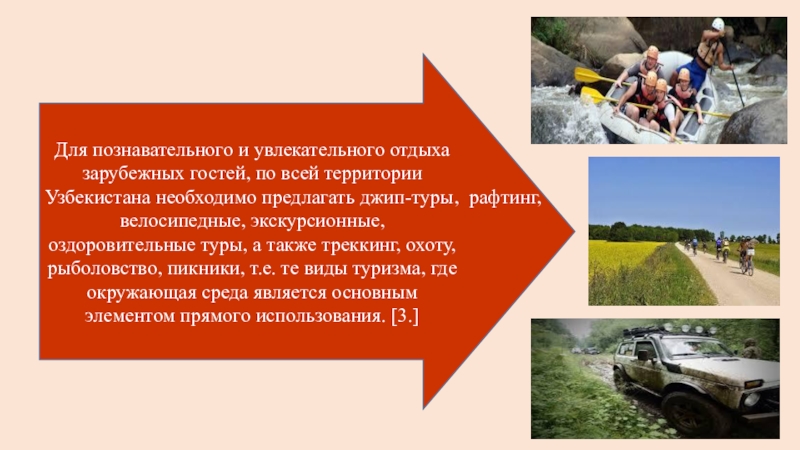 необходимо предлагать джип-туры, рафтинг, велосипедные, экскурсионные, оздоровительные туры, а также треккинг, охоту, рыболовство, пикники, т.е. те виды туризма, где окружающая среда является основным элементом прямого использования. [3.]