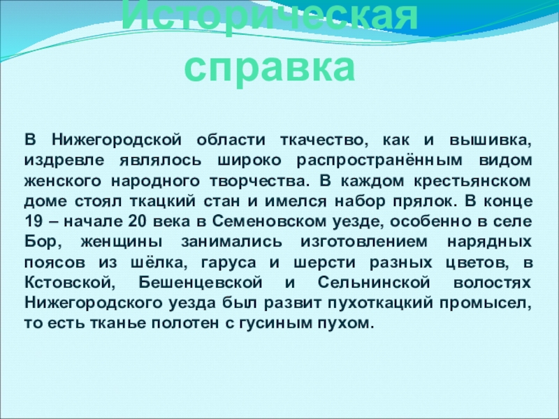 распространённым видом женского народного творчества. В каждом крестьянском доме стоял ткацкий стан и имелся набор прялок. В конце 19 – начале 20 века в Семеновском уезде, особенно в селе Бор, женщины занимались изготовлением нарядных поясов из шёлка, гаруса и шерсти разных цветов, в Кстовской, Бешенцевской и Сельнинской волостях Нижегородского уезда был развит пухоткацкий промысел, то есть тканье полотен с гусиным пухом.