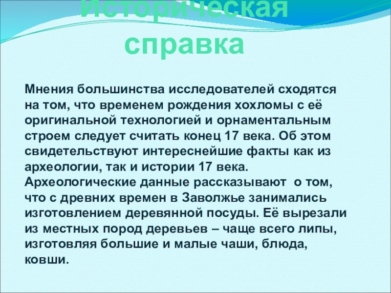 с её оригинальной технологией и орнаментальным строем следует считать конец 17 века. Об этом свидетельствуют интереснейшие факты как из археологии, так и истории 17 века. Археологические данные рассказывают о том, что с древних времен в Заволжье занимались изготовлением деревянной посуды. Её вырезали из местных пород деревьев – чаще всего липы, изготовляя большие и малые чаши, блюда, ковши.