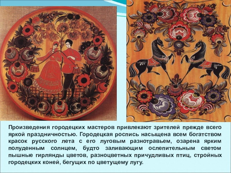 Слайд 16Произведения городецких мастеров привлекают зрителей прежде всего яркой праздничностью. Городецкая роспись