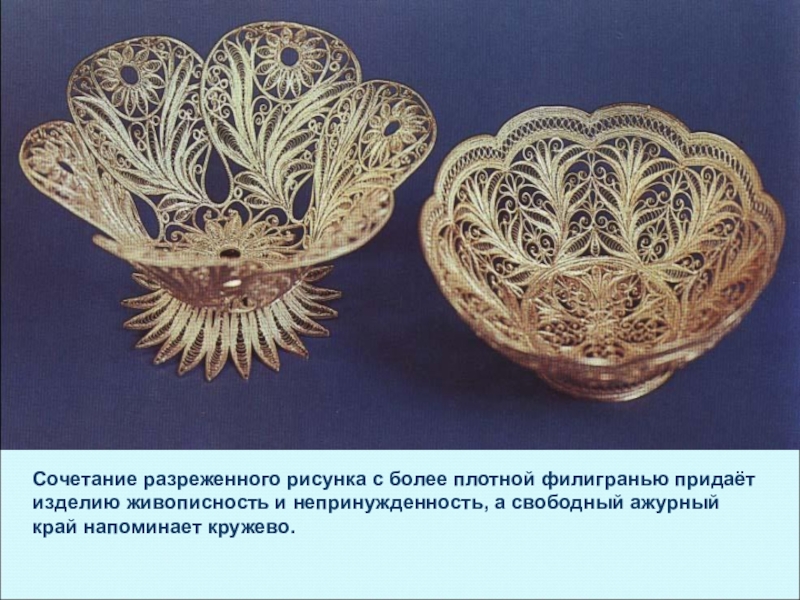 Слайд 28Сочетание разреженного рисунка с более плотной филигранью придаёт изделию живописность и