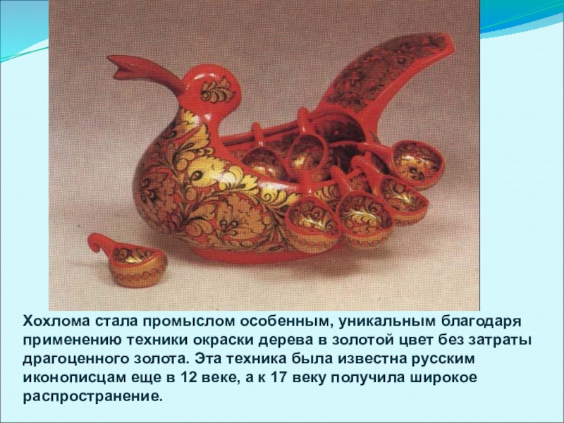 Слайд 8Хохлома стала промыслом особенным, уникальным благодаря применению техники окраски дерева в