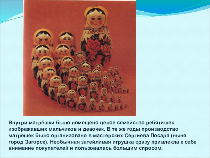 Слайд 12Внутри матрёшки было помещено целое семейство ребятишек, изображавших мальчиков и девочек.