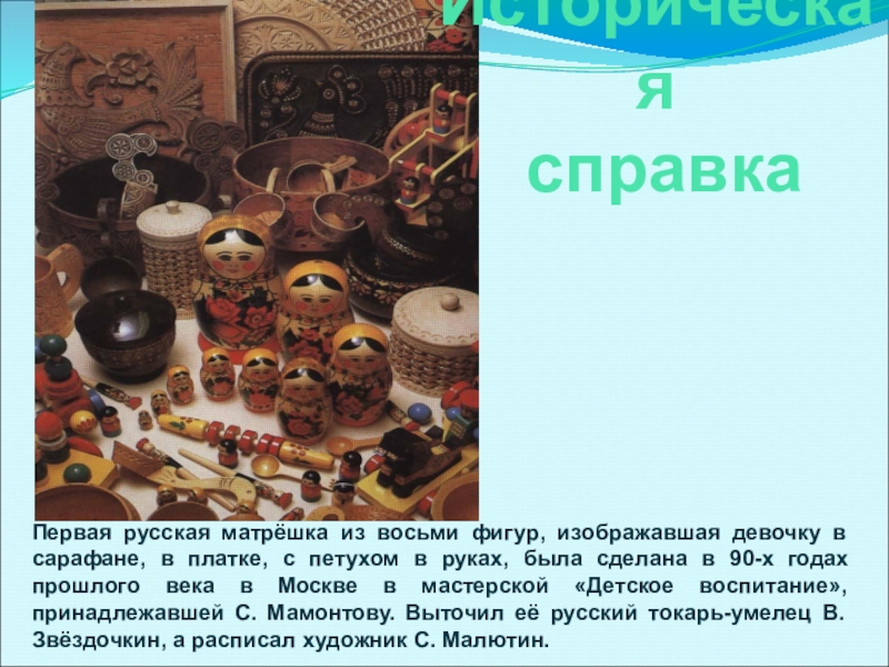 с.Меринове, расположенном на берегу Керженца в 7 километрах от г.Семенова. К этому времени здесь уже существовал промысел по изготовлению токарных игрушек, таких, как самовары, внутрь которых вкладывались игрушечные чашки и блюдца, пирамиды, детские каталки и другие виды изделий.