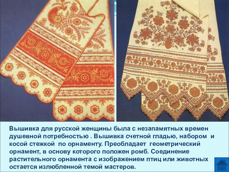 Слайд 25Вышивка для русской женщины была с незапамятных времен душевной потребностью .