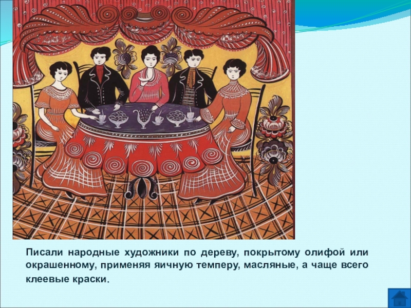 Слайд 17Писали народные художники по дереву, покрытому олифой или окрашенному, применяя яичную